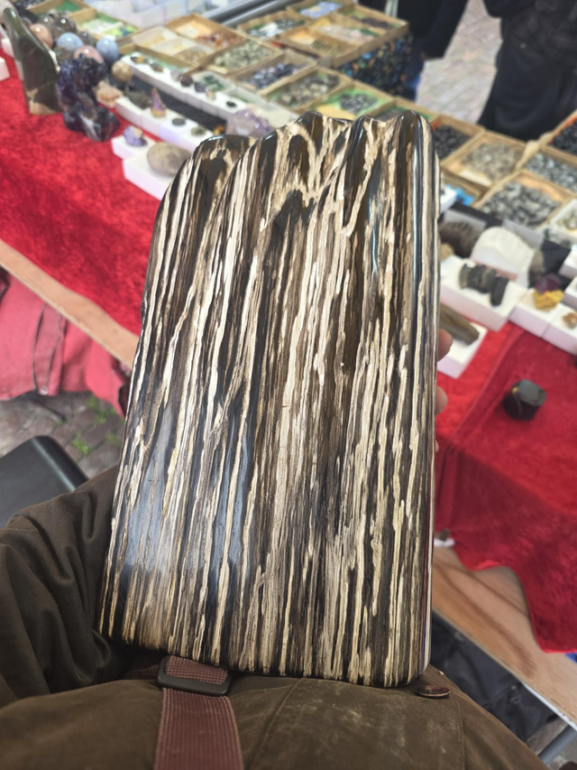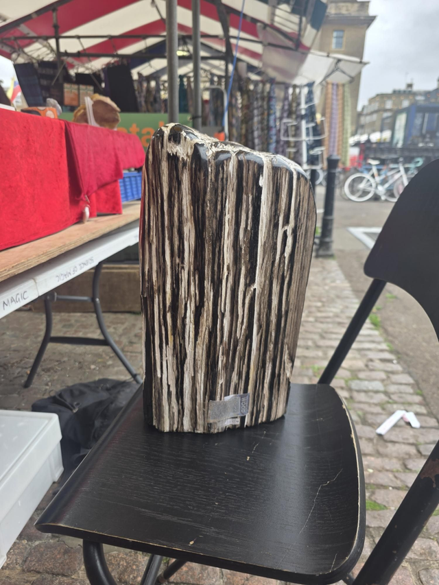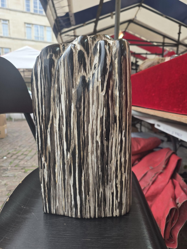 A massive slab of polished fossil wood. This specimen is a Manganese rich fossil, hence the black and white colours. Most fossil wood does not look like this. This particular specimen, with its incredible stripes, is one of a kind.