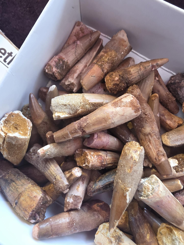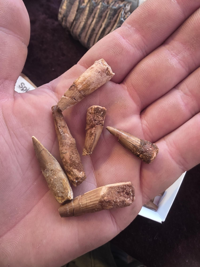 Small spinosaur tips and chunks of teeth. Mined in the Kem-Kem.